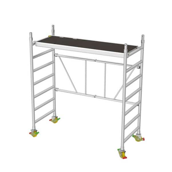 Foldestillads (0,75 x 1,8 m) med foldbar bundsektion for let håndtering og transport. Overlappende afstivning anvendes for yderligere sikkerhed og stabilitet. Komplet med platform hveranden meter, låsbare hjul (125 mm), fodliste sæt og støtteben.